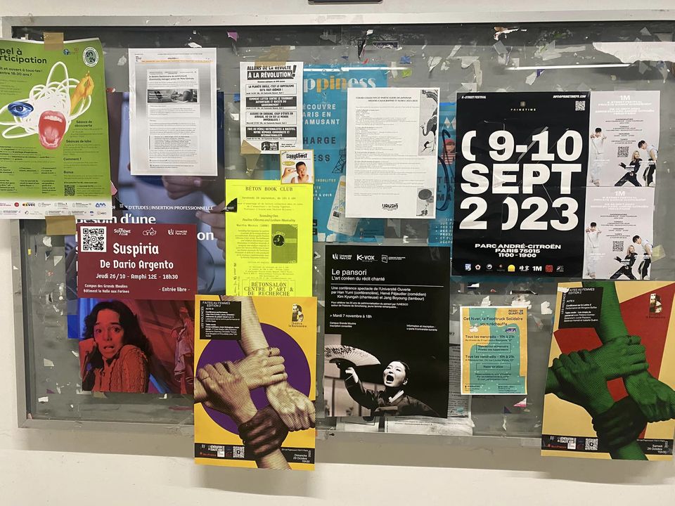 교내 게시판 여기저기에 오늘 행사를 알리는 포스터가 붙어 있습니다.