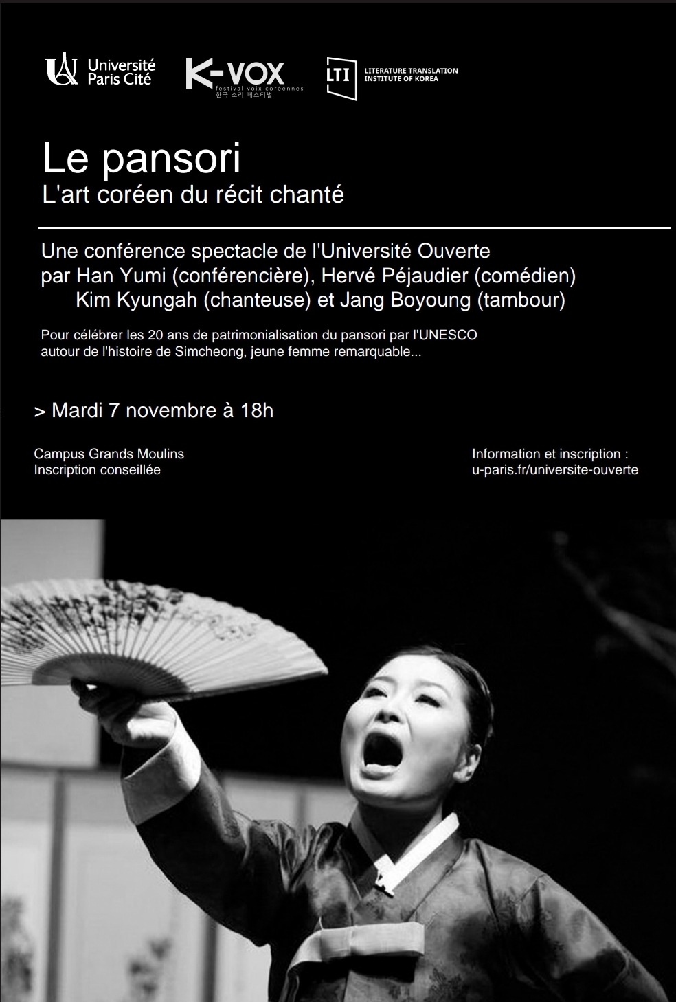 Pour fêter les 20ans de patrimonialisation du pansori par l'Unesco, K-Vox organise le 7 novembre une belle conférence en présence de la chanteuse Kim Kyungah (avec son gosu : Jang Boyoung). RDV à l'université Paris à 18h.